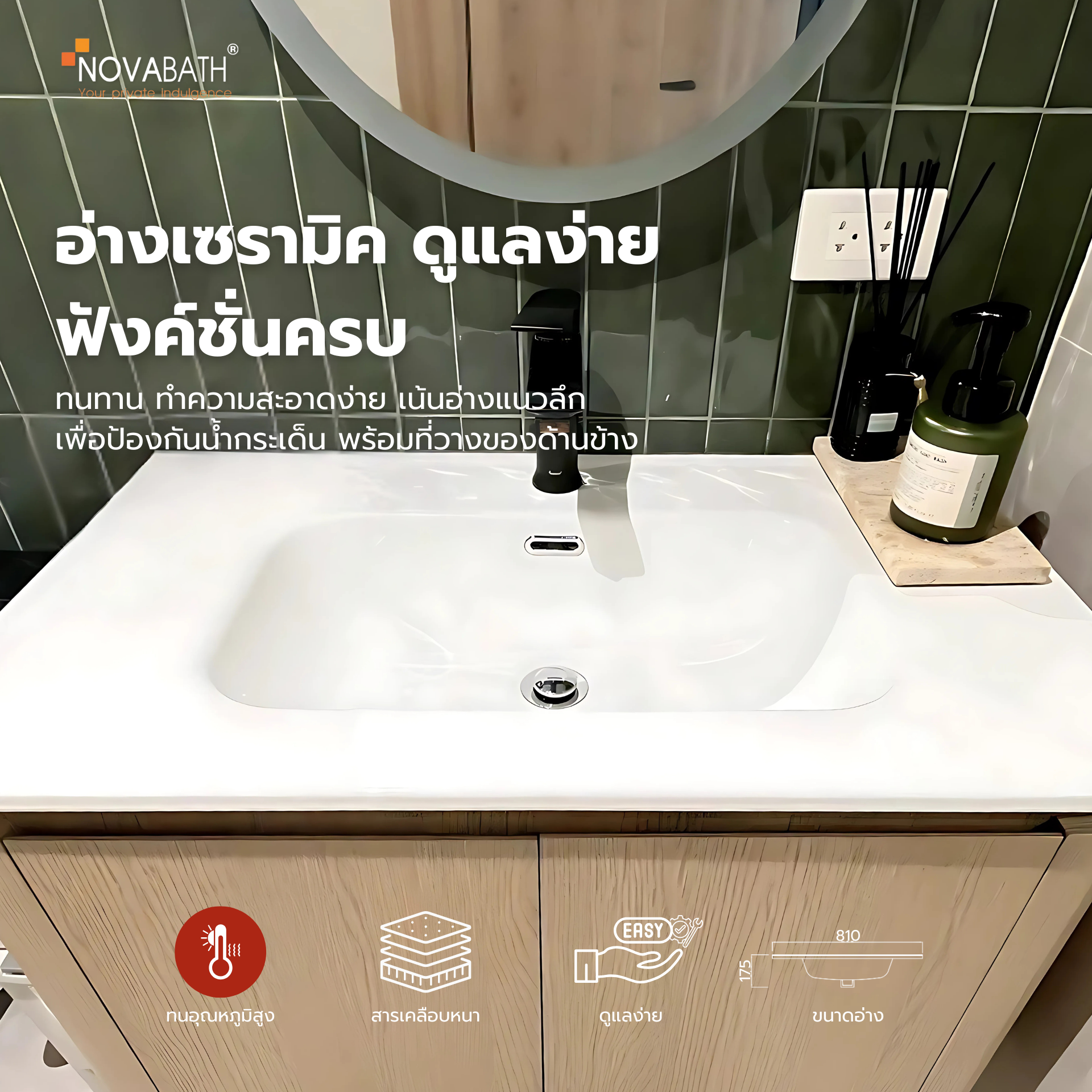 อ่างล้างหน้าที่มากับตู้เป็นอ่างเซรามิค ที่ทนทาน ทำความสะอาดง่าย