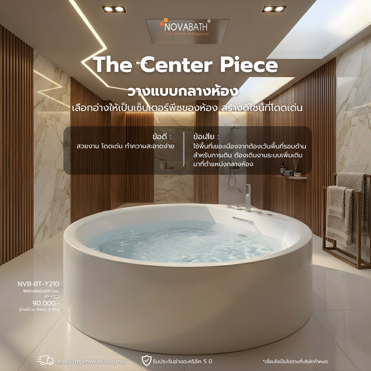 การวางอ่างอาบน้ำไว้กลางห้องน้ำเป็นเทรนด์ที่ได้รับความนิยมสูงในบ้านสมัยใหม่หรือโรงแรมหรู เพื่อยกระดับให้ห้องน้ำดูมีดีไซน์และหรูหรามากยิ่งขึ้น
